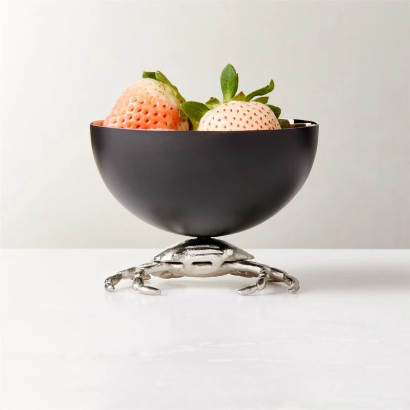 Polished stainless steel mini bowl rests on a solid cast aluminum crab for a bit of eclectic charm. Finished on the outside with a modern matte black powdercoat, mini bowl is perfect for snacks while entertaining. CB2 exclusive.