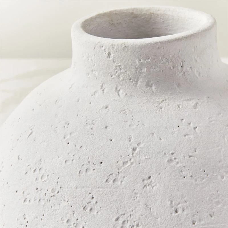 Dramatic curves and a bright matte white glaze, terra cotta vase stuns in its simplicity. Depressions in the surface create a rough texture, giving an organic look that complements bouquets and dried botanicals. Layers beautifully when displayed in a group. CB2 exclusive.