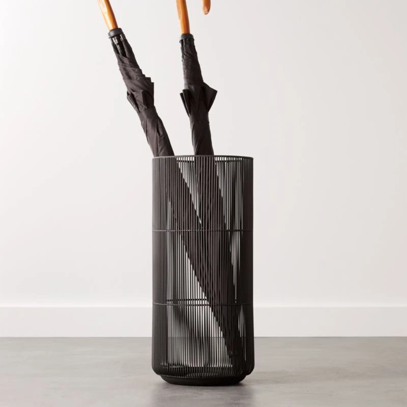 Black iron umbrella stand serves as handsome home for umbrellas between uses. Minimalist silhouette looks neat in any entryway. CB2 exclusive.