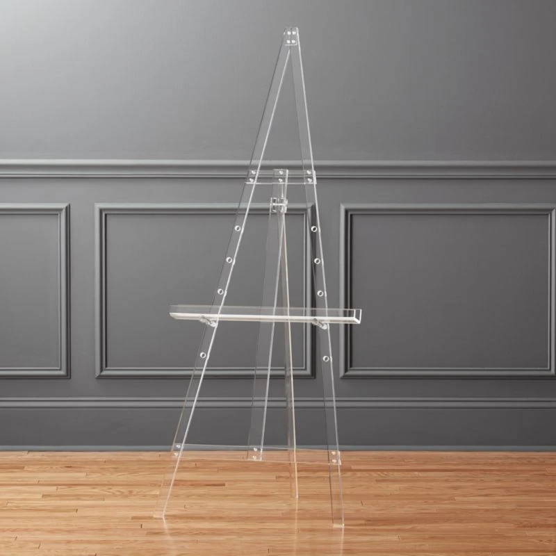 Transparent acrylic easel disappears to float paintings, posters, framed media (see additional photos). Work of art: cool construction with acrylic pegs adjusts five levels to curate pieces up to 39″ high and 2″ deep. Folds flat to store, disappears again. acrylic tripod easel is a CB2 exclusive.
