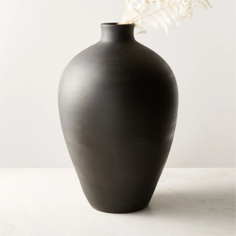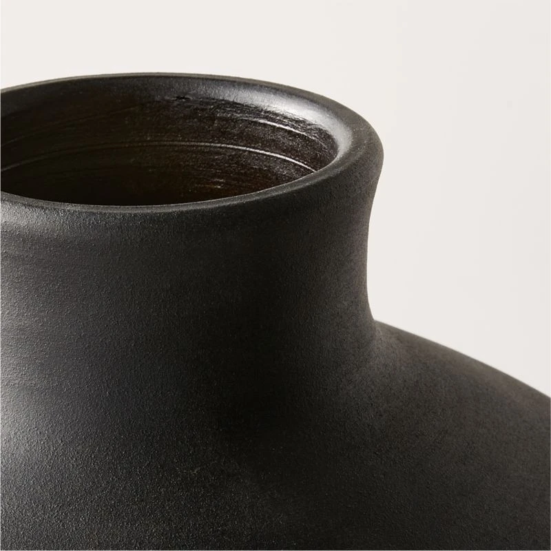 Using the same techniques developed during pre-Incan times, artisans in Chulucanas, Peru, have crafted this terra cotta vase by hand from start to finish. Terra cotta is shaped into a large round vessel on a potter’s wheel. Once dry, the terra cotta is baked in a kiln until it takes on its signature blackened look. Finished with a matte black cold glaze, terra cotta vase is beautiful on its own or when displaying dried botanicals. CB2 exclusive.