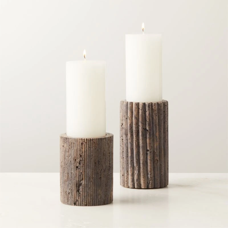 Carved out of solid grey travertine, fluted candle holder supports a single pillar. Naturally porous travertine is unfilled to keep the organic texture intact, each varying in level of activity. Designed with a thinner fluting detail, small candle holder pairs beautifully with the larger size. CB2 exclusive.