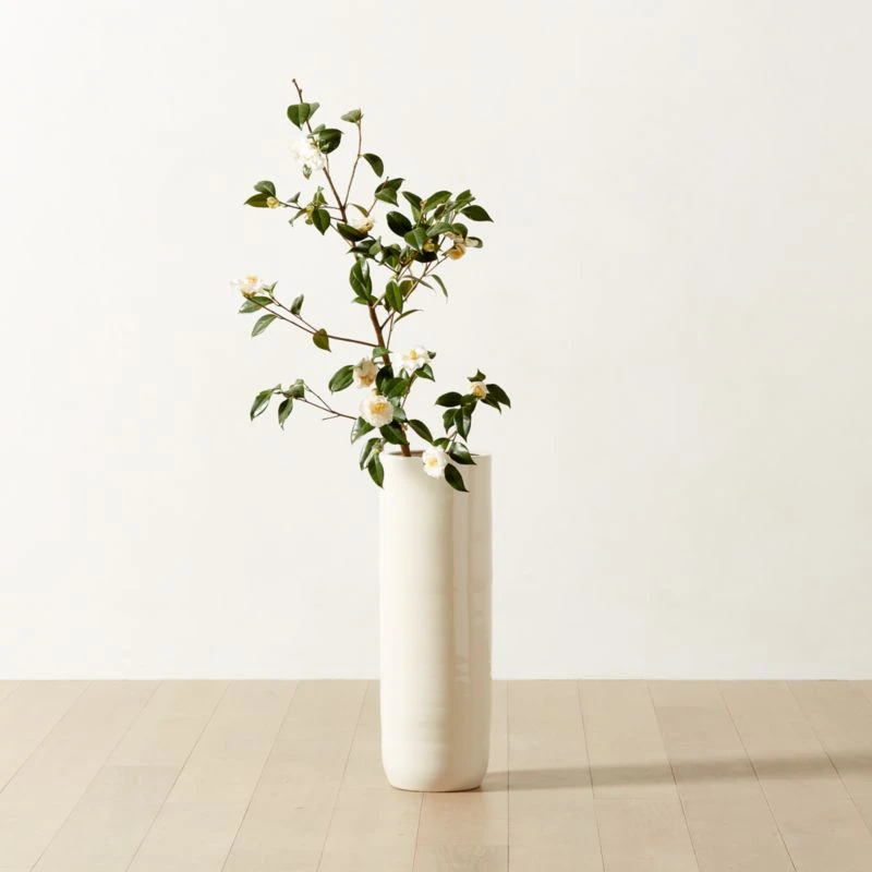 White stoneware floor vase embodies a classic minimalist aesthetic. The elongated silhouette commands any space, whether showcasing tall greenery or dried botanicals. CB2 exclusive.