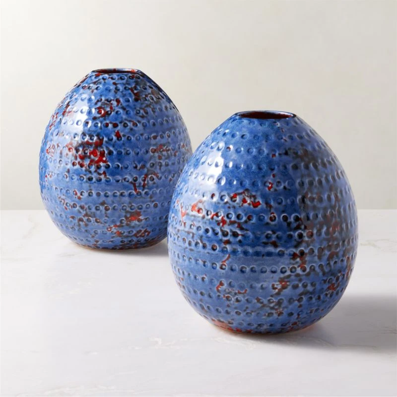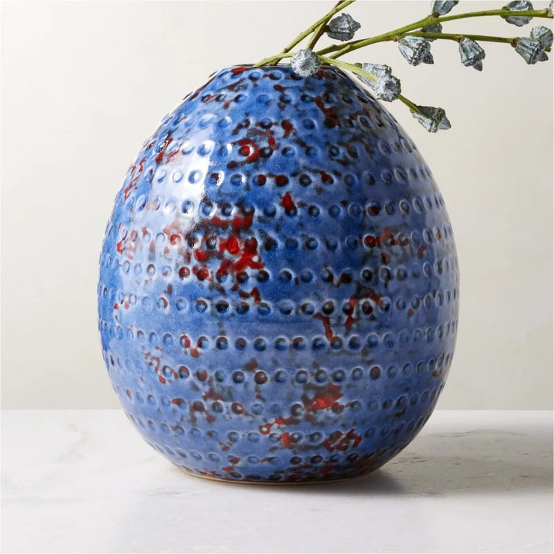 Handcrafted in Portugal, glazed earthenware vase is a striking accent, whether standing alone or displaying dried botanicals. Influenced by German glazing techniques prevalent in midcentury and postmodern designs, the vessel’s simple shape gains visual interest from the blue glaze’s explosive reaction when fired. Pops of vibrant red from a unique selenium glaze can be seen underneath. CB2 exclusive.