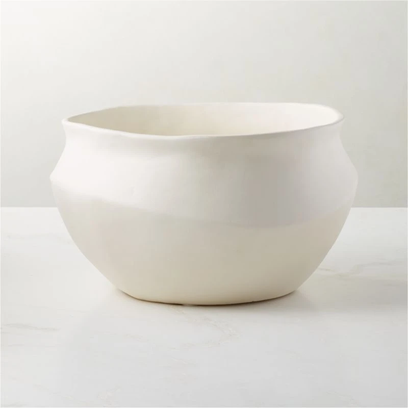 Designed by Kara Mann, small white storage basket is made from ecomix—a mixture of recycled paper and chalk powder. Its flowing texture and tidal wave design create an organic feel, perfect for styling on a bookshelf. CB2 exclusive.